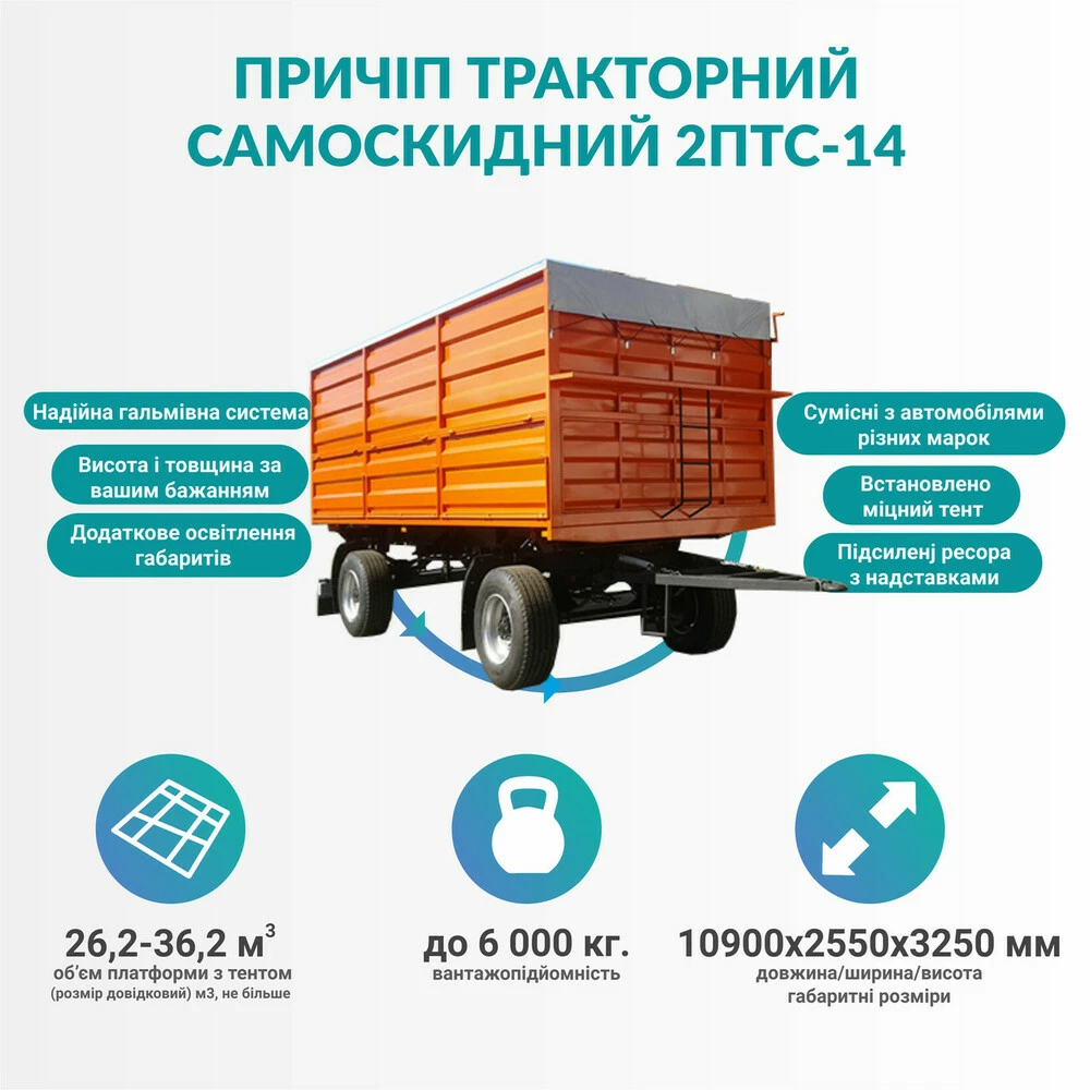Трисмуговий 3ПТС-30 призначений для тракторів із потужністю понад 200 л.с. У нього високі вантажність і об'єм кузова — відповідно 24,5 тонни та 30 кубометрів.